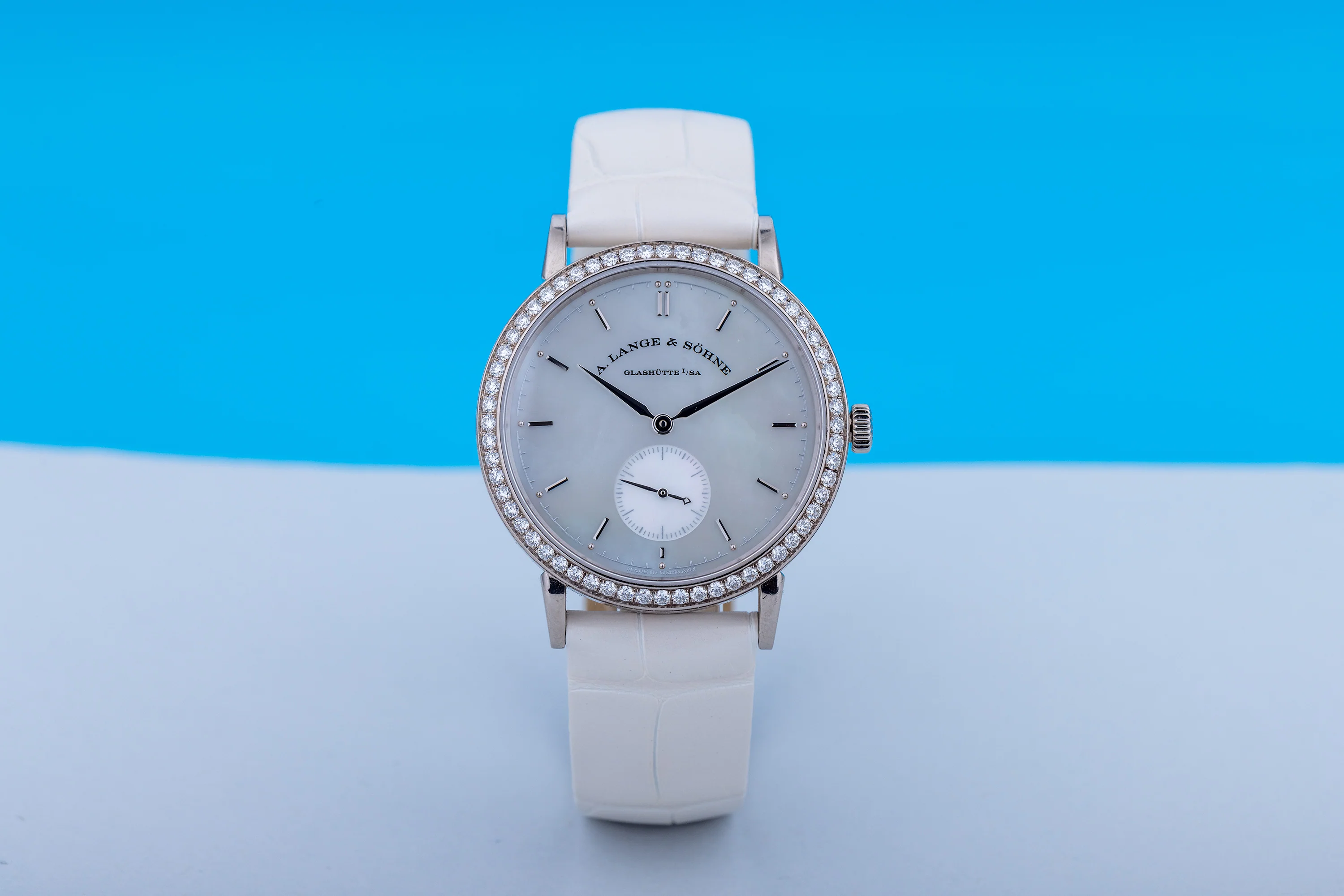 Pre-owned, excellent condition A. Lange & Söhne Saxonia reference 878.029 18k White Gold ladies wristwatch. Mother of Pearl dial, seconds sub-dial at 6 o'clock, an 18k White Gold 35mm case, diamond bezel, winder and classic pin buckle, an A. Lange & Söhne white iridescent leather strap, sapphire crystal glass and sapphire glass exhibition case back revealing the stunning manual winding movement.
