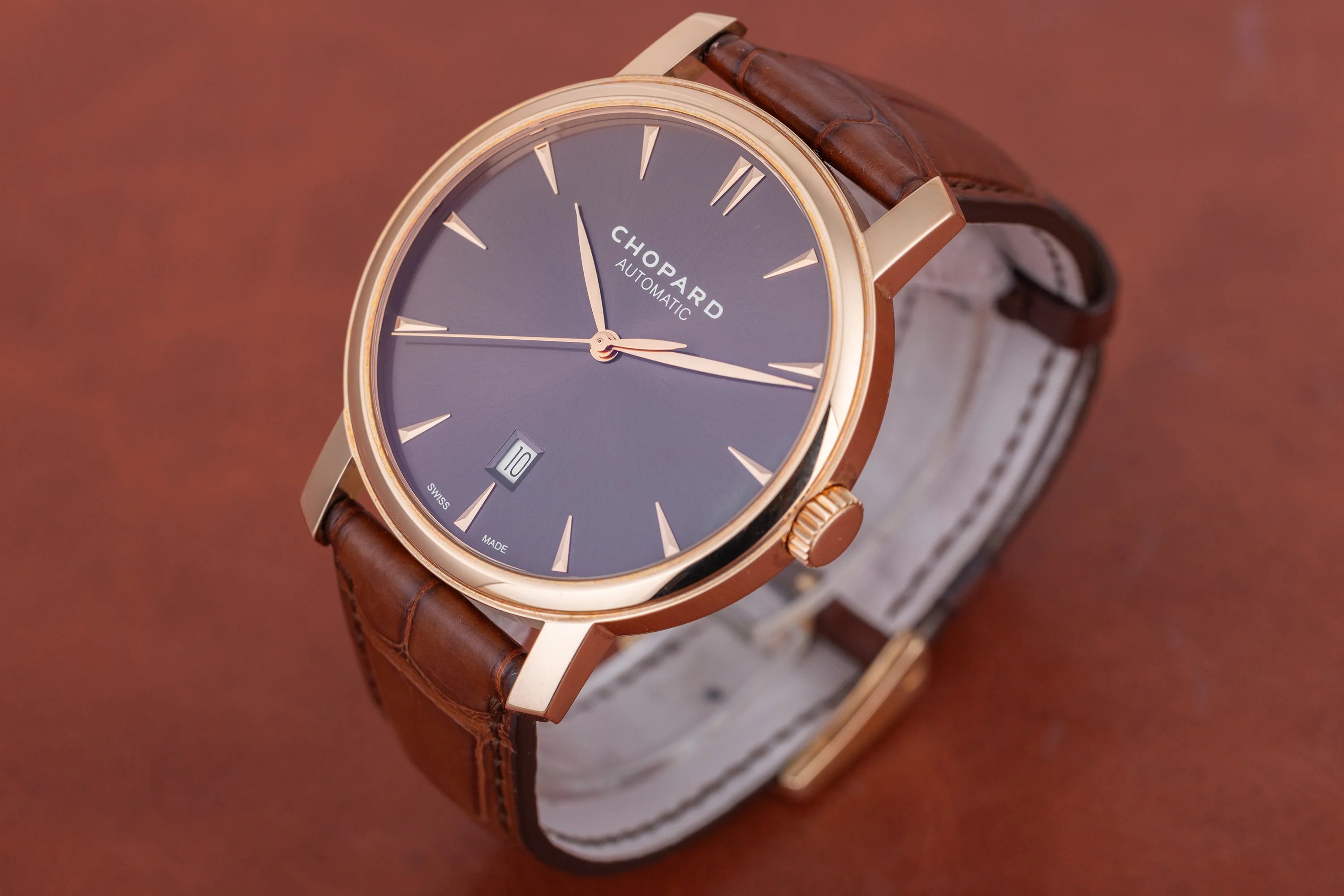 Pre-owned, excellent condition Chopard Classic Automatic with Date reference 161278-5012 18k Rose Gold gents wristwatch. Brown Chocolate dial, gold baton hour markers, date display at 6 o'clock, an 18k Rose Gold 40mm case, smooth bezel, winder and classic pin buckle, a Chopard brown leather strap, sapphire crystal glass, automatic movement and power reserve of approximately 42 hours.
