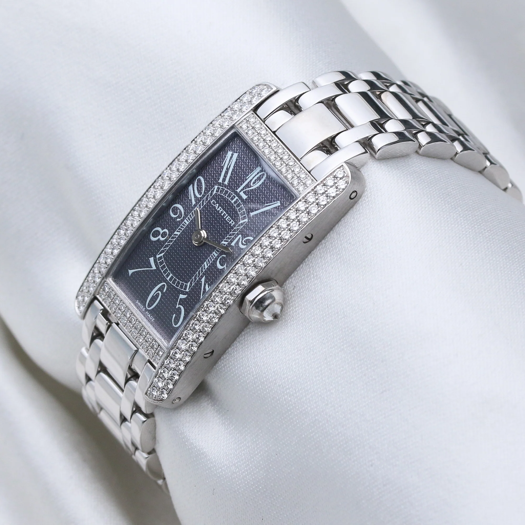 Pre-owned, excellent condition Cartier Tank Americaine reference 2489 18k White Gold gents wristwatch, circa 2000's. Grey dial, with light grey Arabic numeral hour markers, housed in an 18k White Gold 19mm rectangle-shaped case, adorned with a double-row diamond setting on the case and bezel, winder with a diamond, bracelet and double folding deployant clasp, sapphire crystal glass and quartz movement.