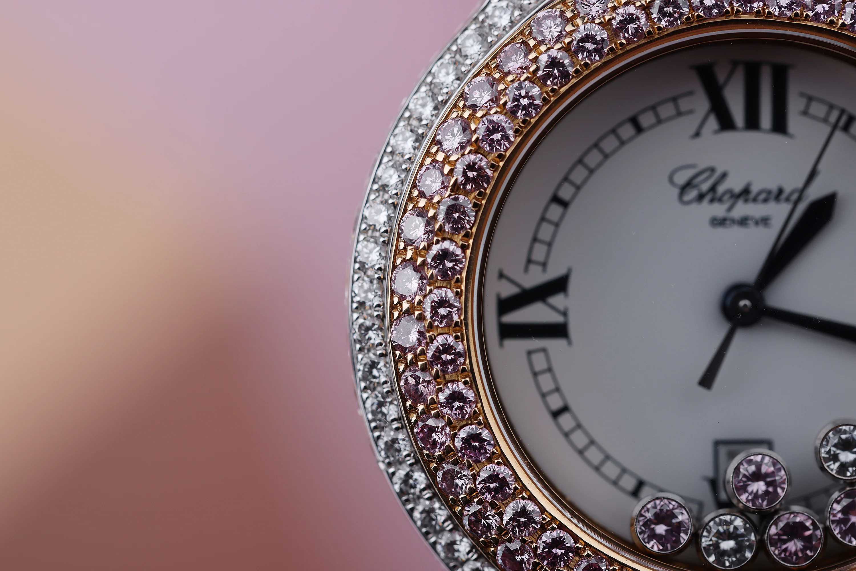 Pre-owned, excellent condition Chopard Happy Sport reference 4144 18k White & Rose Gold ladies wristwatch. White dial, four quartered Roman numeral hour markers, date display in an aperature at 6 o'clock, seven 'floating' happy diamonds (4 pink diamonds and 3 diamonds), an 18k White & Rose Gold 32mm case with a double row pink diamond bezel, a single row diamond covered case, an 18k Rose Gold winder with a diamond, an 18k White Gold Chopard pin buckle, a pink leather Chopard strap, sapphire crystal glass and quartz movement.