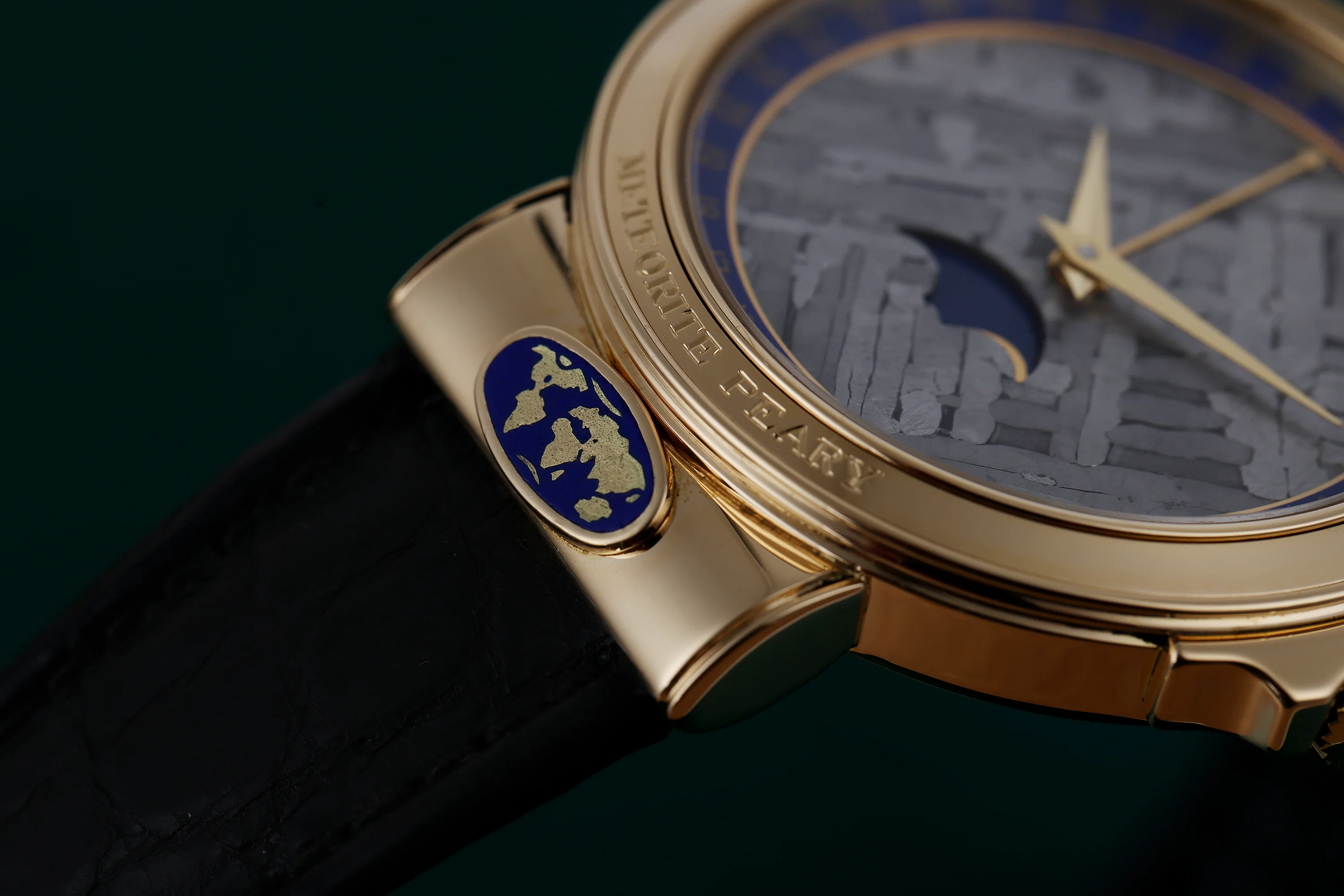 Pre-owned, excellent condition Corum Meteorite Peary reference 81.450.56 18k Yellow Gold unisex wristwatch. Meteorite dial with Moonphase display at 6 o'clock, date display on the blue enameling on the circumference of the dial, an 18k Yellow Gold 34mm case, bezel, winder, shoulders with blue enameling showing the individual watch number and world map, black leather strap, 18k Yellow Gold and Stainless Steel double folding deployant clasp, sapphire crystal glass and quartz movement.