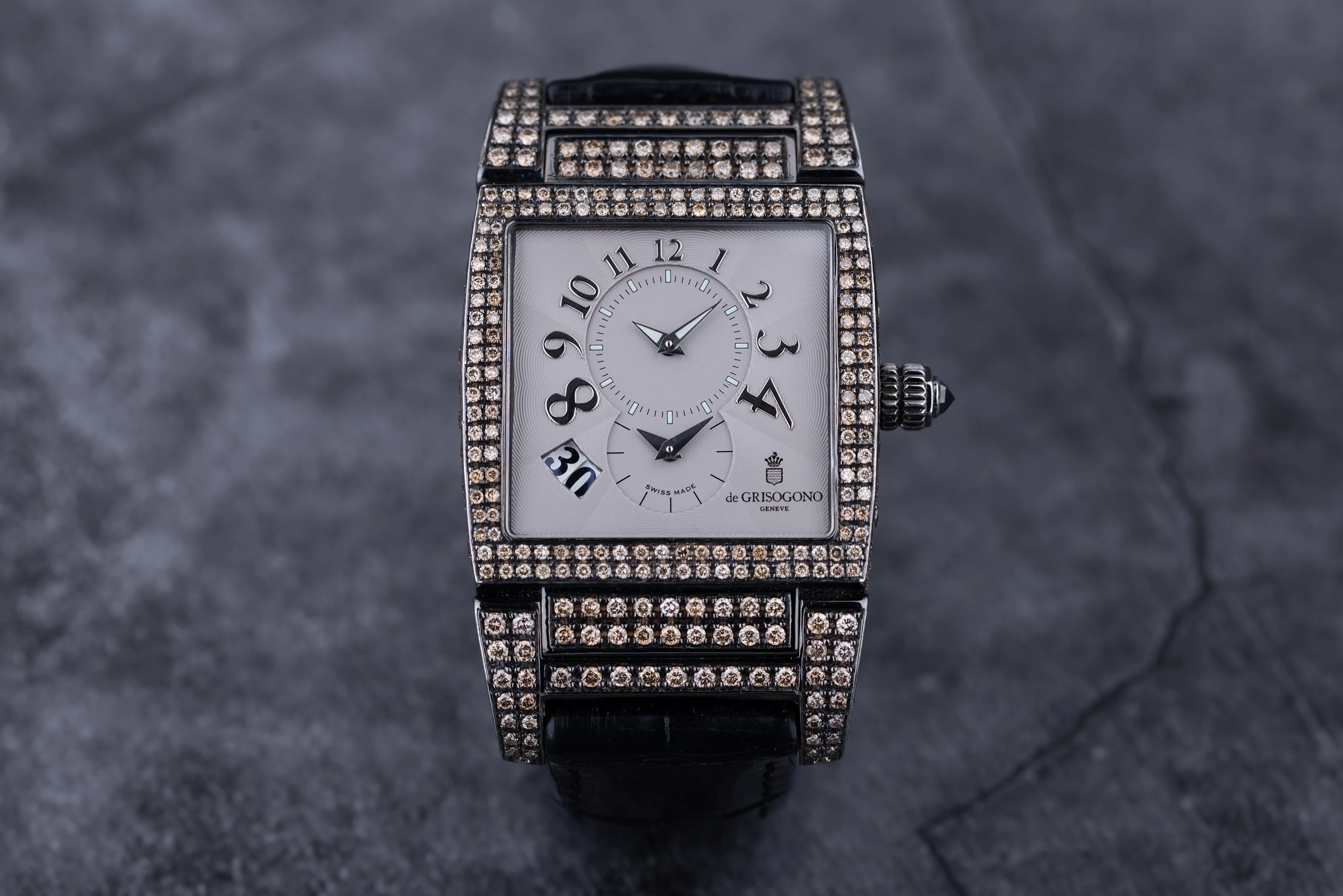Pre-owned, excellent condition De Grisogono Instrumento N°UNO reference UNO/DF Stainless Steel unisex wristwatch. Grey-Lilac dial, Arabic numeral hour markers, date display in an aperture at 7 o'clock, Stainless Steel minute and hour hands for the two time zones displayed in respective sub-dials, a Stainless Steel 33mm diamond case and bezel, winder with a black diamond and diamond double folding clasp. A De Grisogono black alligator strap, sapphire crystal glass and automatic movement.