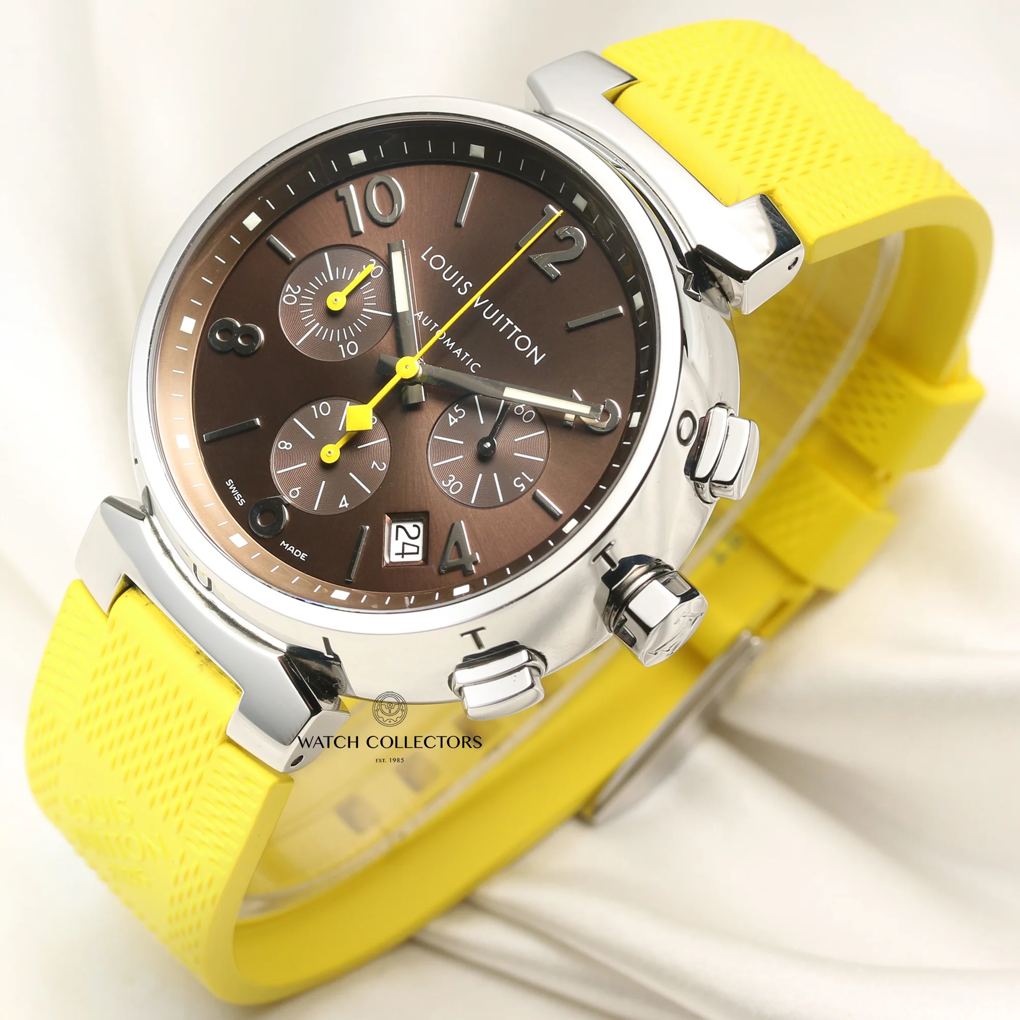 Preowned, excellent condition Louis Vuitton Tambour Chronograph Stainless Steel gents wristwatch. Chocolate brown dial, a yellow chronograph second hands, Arabic numeral and baton hour markers, 3 chronograph sub-dials with yellow and steel hands, date display in an aperture at 4 o'clock, a Stainless Steel 41 mm case, bezel, winder, pushers and classic pin buckle, a brand new Louis Vuitton yellow rubber strap, sapphire crystal glass, automatic movement and water resistant up to 100m. This watch comes with a Louis Vuitton pouch and box, with our certificate of authenticity and with our own 24 months warranty. We guarantee that this watch has been tested thoroughly for time accuracy, functionality and has been serviced to the highest standards according to the manufacturers specification. We have performed a very precise condition check to determine the level of refurbishment required to meet our high standards of quality. This watch has been checked against technical records to guarantee authenticity and clean history.