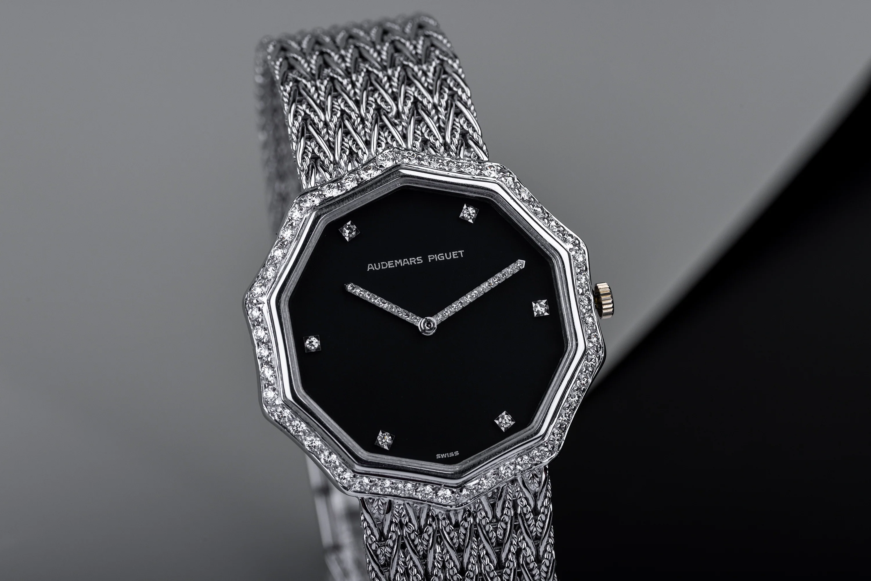 NOS: Audemars Piguet 1970s Gents Wristwatch | Decagon Case | 18k White Gold | Black Dial | Diamond Hours & Bezel | Rare Gold Movement