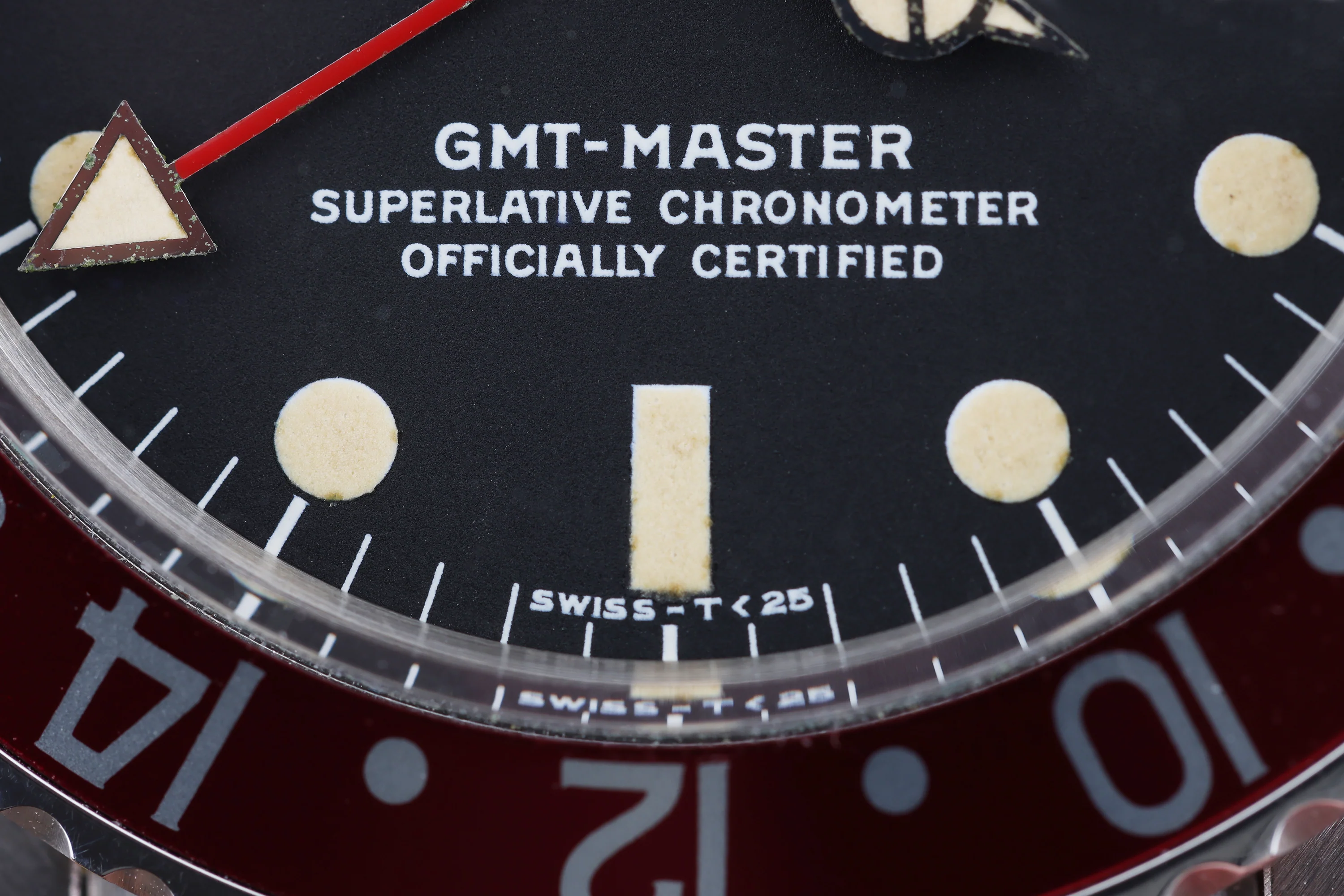 Pre-owned, excellent condition Rolex GMT-Master "Pepsi" reference 1675/0 Stainless Steel gents wristwatch. Matte Black 'SWISS-T<25' dial, with Tritium filled hour markers which have developed a lovely creamy patina over the years, date display at 3 o'clock, housed in a Stainless Steel 40mm case, with a unidirectional rotatable bezel with a Red and Blue 'Pepsi' insert, winder, Oyster bracelet and deployant clasp, acrylic glass and automatic movement. This watch has a serial beginning: 338XXXX, meaning it was produced in 1972.