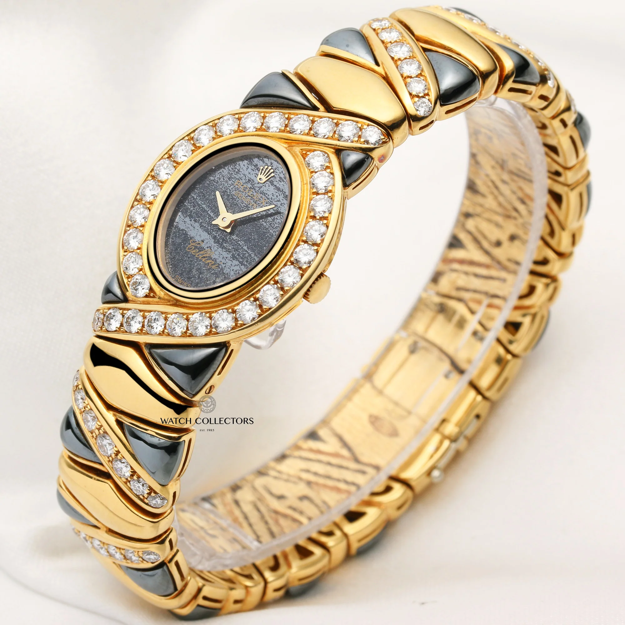 Pre-owned, excellent condition rare, unpolished and factory Rolex cellini 18k Yellow Gold ladies wristwatch. Rare ferrite dial, 18k Yellow Gold 22mm case, winder and diamond bezel, an 18k Yellow Gold diamond & stone bracelet and jewellery clasp, manual winding movement and sapphire crystal glass. The watch has a serial: N58XXXX and was made in 1991. This watch comes with the original Rolex papers, with a Rolex box and with our own 24 months warranty.