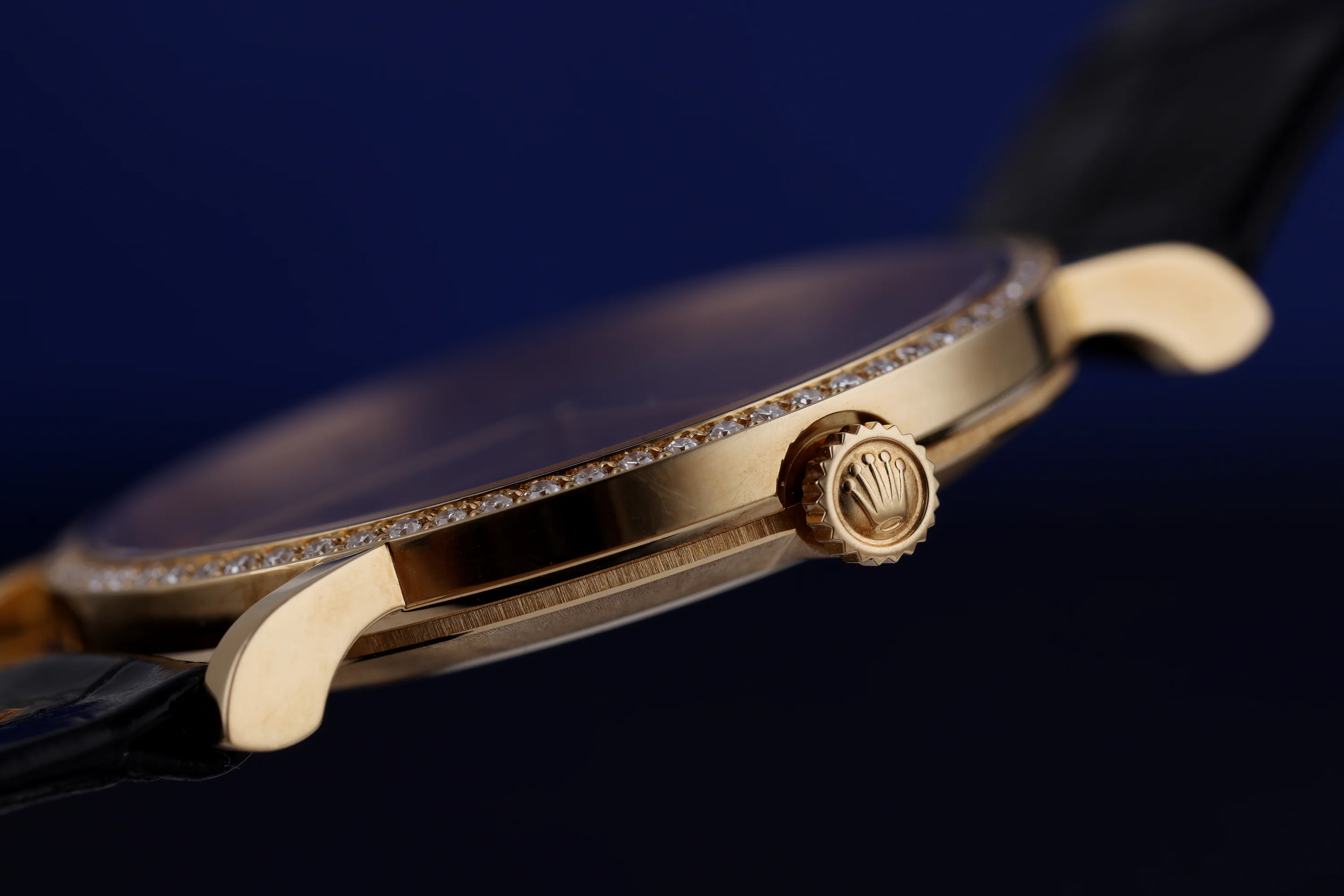 Pre-owned, excellent condition Rolex Cellini reference 5114 18k Yellow Gold unisex wristwatch. Gold Jubilee dial, Arabic numeral applied hour markers, an 18k Yellow Gold 32.5mm case, diamond bezel, winder and classic pin buckle, a Rolex black leather strap, sapphire crystal glass and manual wind movement. This watch has a W serial and was produced in 1995.
