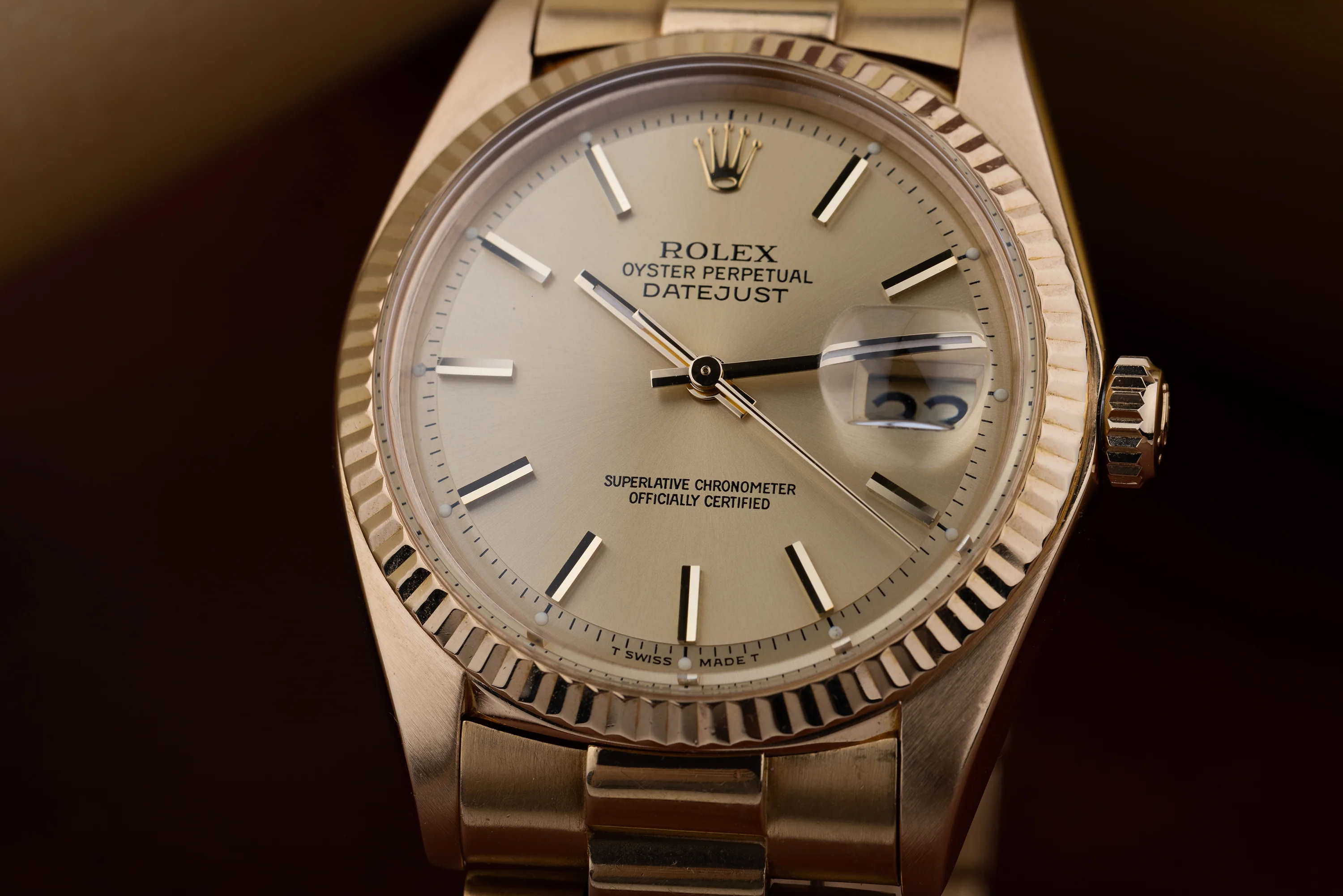 Pre-owned, excellent condition Rolex DateJust 36 reference 1601/8 18k Yellow Gold gents wristwatch. Gold dial, baton hour markers, date display at 3 o'clock, an 18k Yellow Gold 36mm case, fluted bezel, winder, President bracelet, deployant clasp and automatic movement. This watch has a serial: 380XXXX and was produced in 1974.
