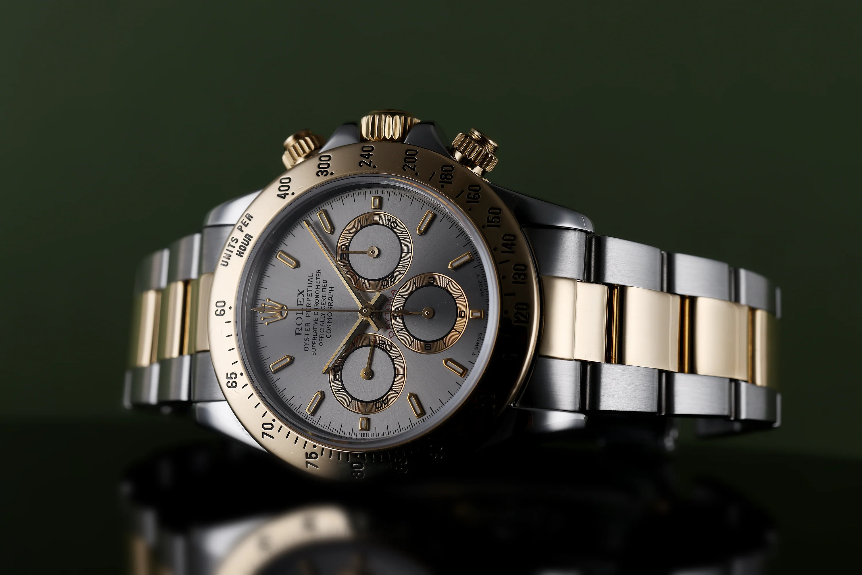 Pre-owned, excellent condition Rolex Daytona Zenith reference 16523 Stainless Steel & 18k Yellow Gold gents wristwatch. Silver dial, Gold baton hour markers, a Stainless Steel 40mm case, an 18k Yellow Gold bezel, winder and pushers, a Stainless Steel & 18k Yellow Gold Oyster bracelet and deployant clasp, sapphire crystal glass, automatic movement and waterproof up to 100m.