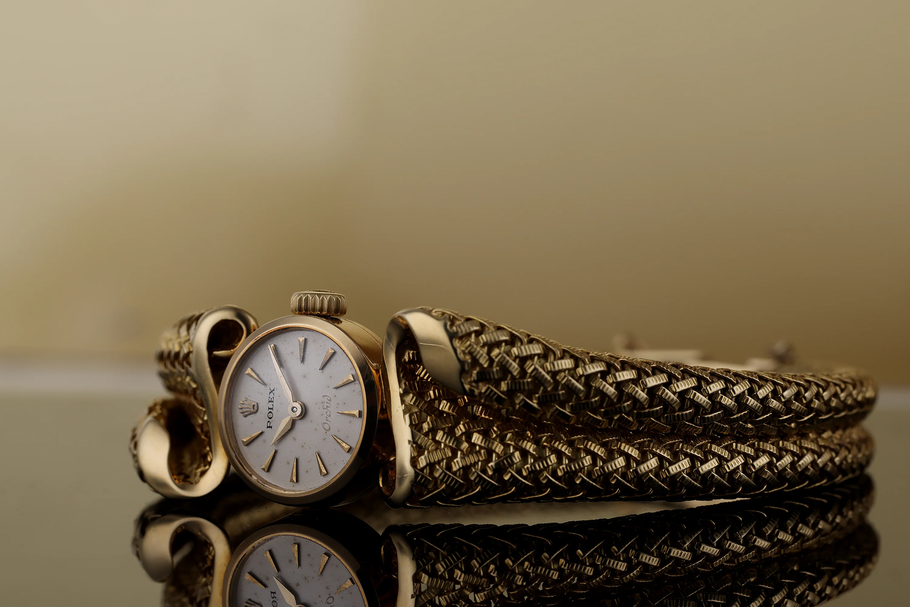 Pre-owned, excellent condition Rolex Orchid reference 9524 18k Yellow Gold ladies wristwatch. Silvered dial, applied dagger hour markers, 'Orchid' marking at 6 o'clock, housed in an 18k Yellow Gold 16mm round case, with smooth bezel, crown, integrated woven curled bracelet which tapers in width towards the Rolex signed clasp, sealed with the Rolex crown, sapphire crystal glass and Manual Wind movement. This watch has a serial beginning: 549XXX, dating it's production to 1960.