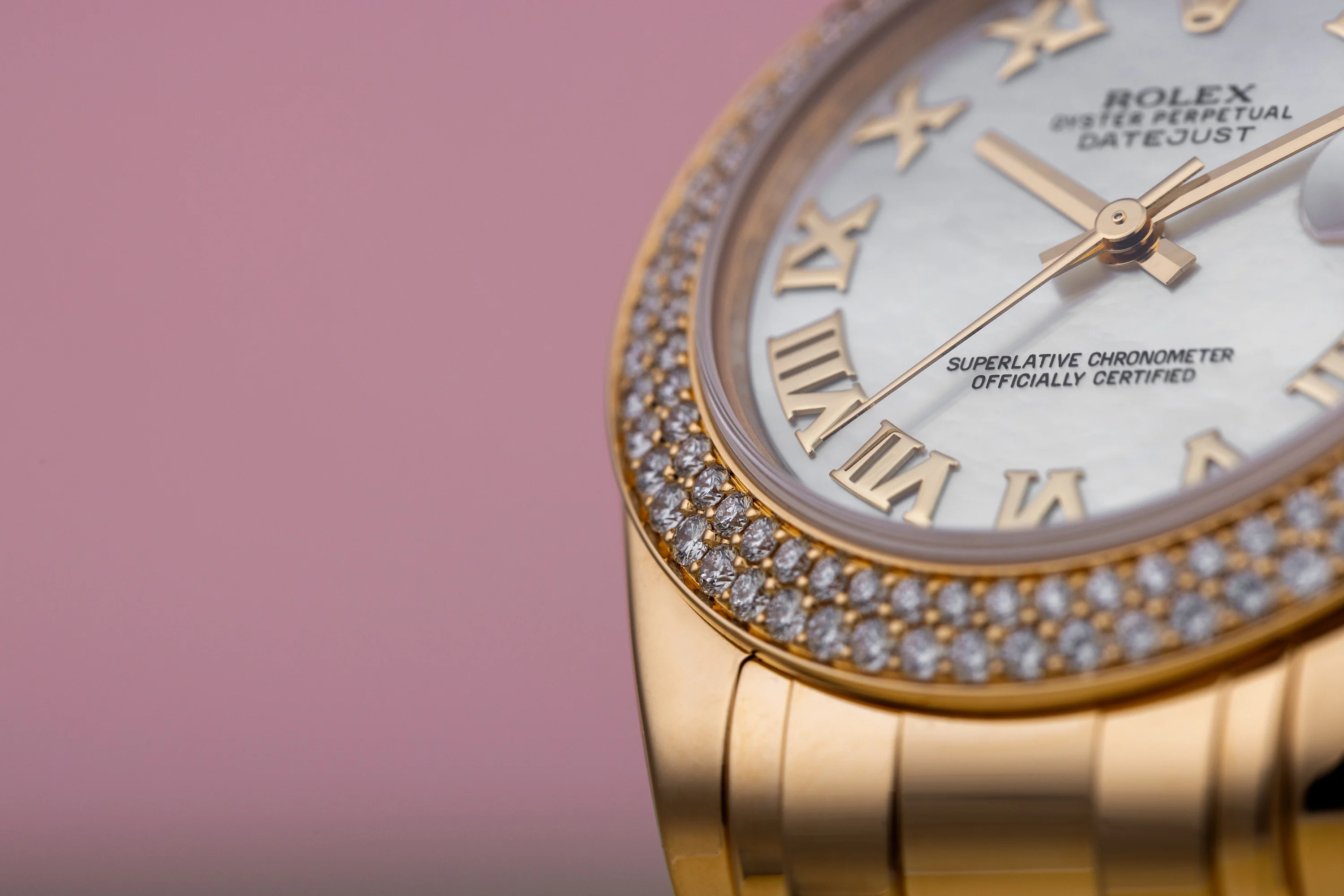 Rolex Pearlmaster DateJust 34 | REF. 81338 | Mother of Pearl Roman Dial | Double Diamond Bezel | Box & Papers | 2012 | 18k Yellow Gold