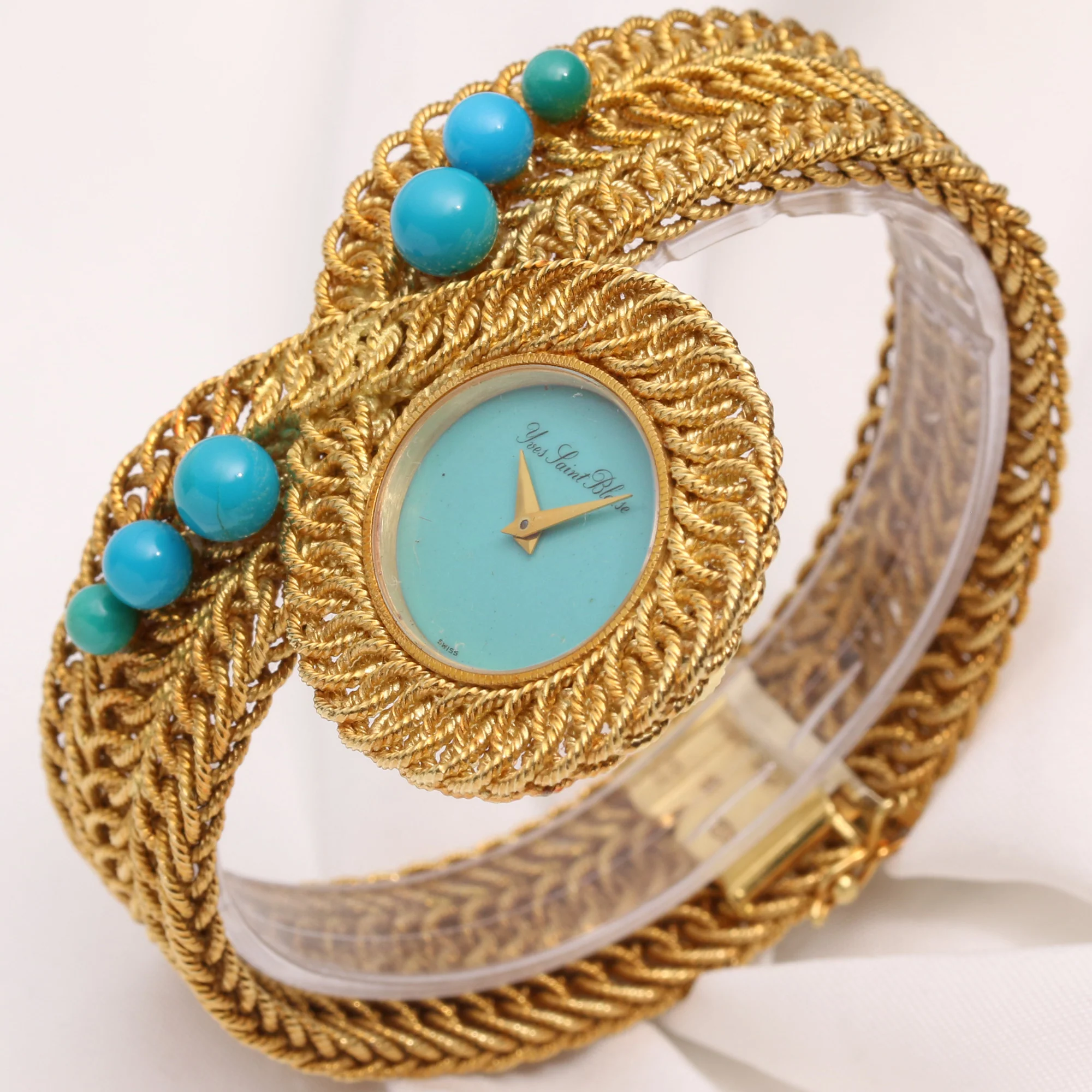 Preowned, excellent condition vintage 1970's Yves Saint Blaise 18K Yellow Gold ladies wristwatch. Turquoise dial, 18k gold minute and hour hands, 30mm case, winder hidden under the jewellery-style bezel, 18k Yellow Gold jewellery bracelet with circular turquoise and teal adornments, 18k Yellow Gold jewellery clasp, Sapphire crystal glass and manual winding movement. This very unique and beautiful watch which also styles as a bracelet is typical of the 1970's jewellery-style of ladies watches. This watch comes with our own certificate of authenticity, our own 24 months warranty and with one of our own boxes.